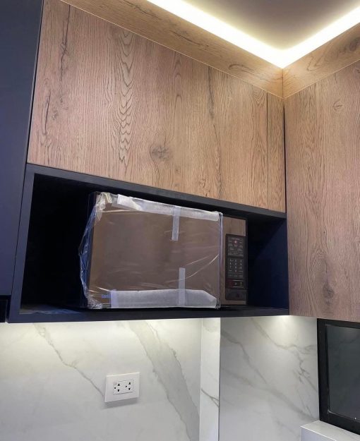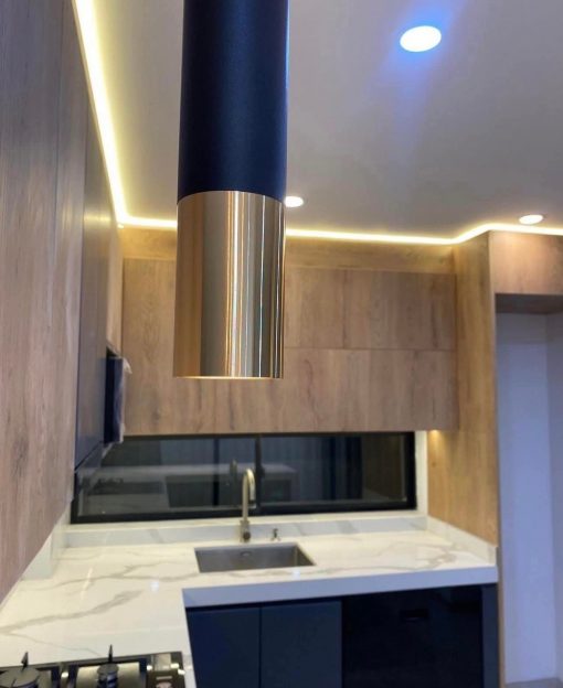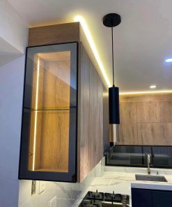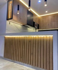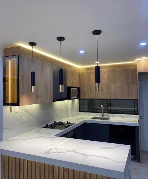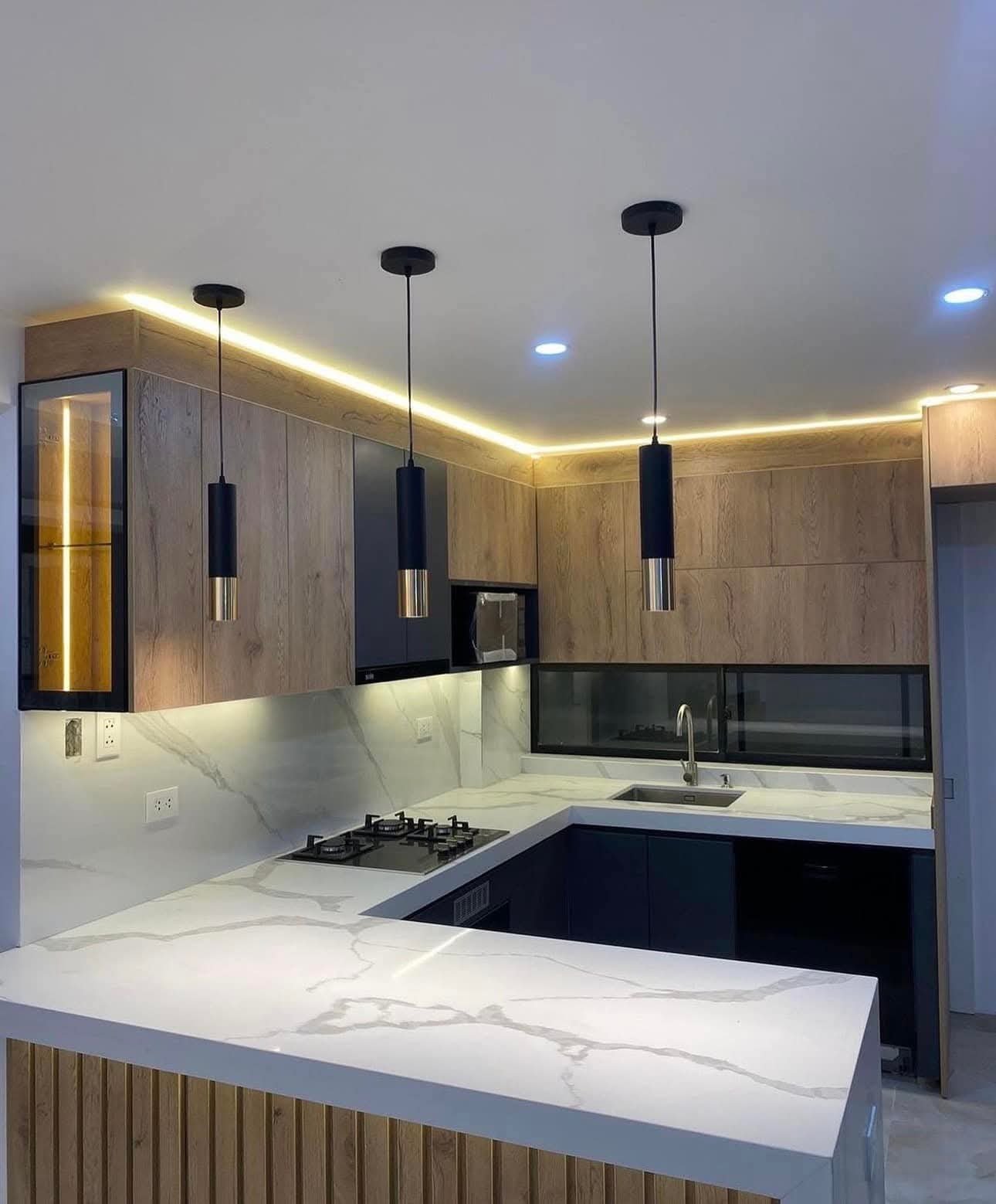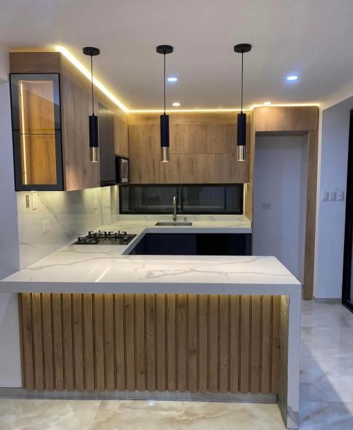 Cocina fabricada en madera de encino con iluminación.